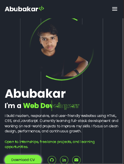 I build modern, responsive, and user-friendly websites using HTML, CSS, and JavaScript. Currently learning full-stack development and working on real-world projects to improve my skills. I focus on clean design, performance, and continuous growth.