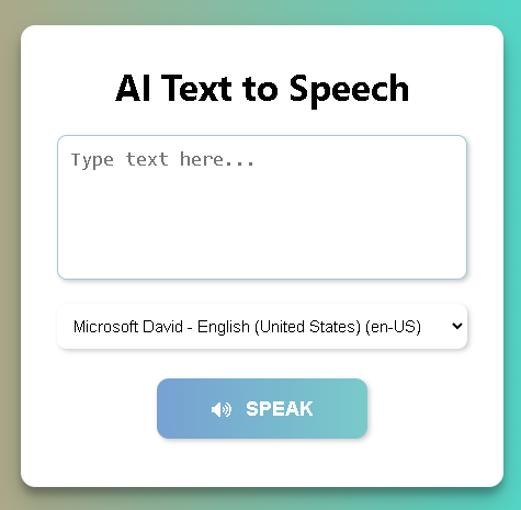Built a responsive AI-powered Text-to-Speech web application using the Web Speech API. Users can convert typed text into real-time speech with multiple voice options, adjustable rate and pitch, and smooth user interaction. Designed with a modern UI and optimized for performance without using any external libraries.